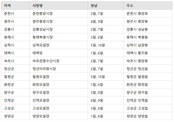 강원도의 주요 오일장 일정은 다음과 같습니다. 각 장터는 매달 특정 날짜에 열리며, 신선한 농산물과 다양한 지역 특산품을 만날 수 있습니다.