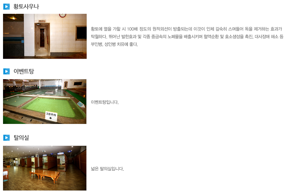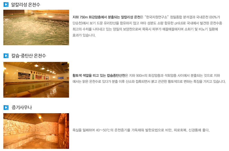온천수에 함유된 미네랄 성분은 피로 회복에 좋고, 특히 피부 미용 에 탁월한 효과가 있습니다. 피부에 보습을 더해주고, 피로한 근육을 이완시켜 전신에 활력을 더해줍니다.
