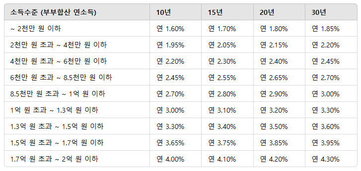 - 맞벌이의 경우 합산 2억 원 이하이며, 개별 소득은 1억 3천만 원을 초과할 수 없습니다.