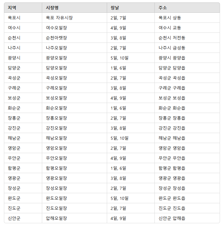 전라남도의 주요 오일장 일정은 다음과 같습니다. 전라남도의 오일장은 매달 특정 날짜에 열리며, 신선한 농산물과 해산물, 다양한 지역 특산품을 만나볼 수 있습니다.