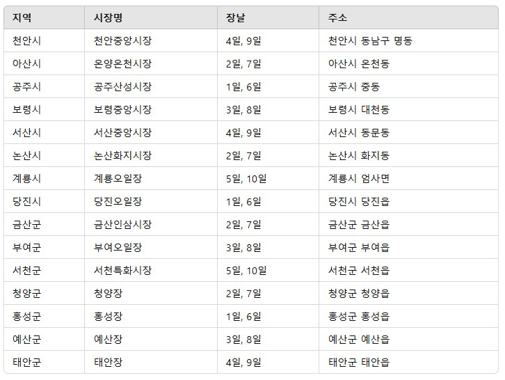 충청남도의 오일장에서는 신선한 농산물, 해산물, 전통 먹거리 등 다양한 품목을 저렴하게 구입할 수 있습니다. 위의 일정을 참고하여 방문 계획을 세워보세요!