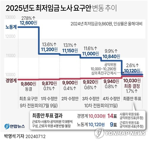 2025년 최저시급은 1만 30원으로 결정되었으며, 이는 인상률 1.7% 에 따른 결과입니다. 이 인상률은 2021년(1.5%) 이후 두 번째로 낮은 수준으로, 노동계에서는 물가상승률을 반영하지 못했다는 비판을 제기했습니다. 반면 경영계는 이번 인상도 상당한 부담으로 작용할 것이라고 우려하고 있습니다.